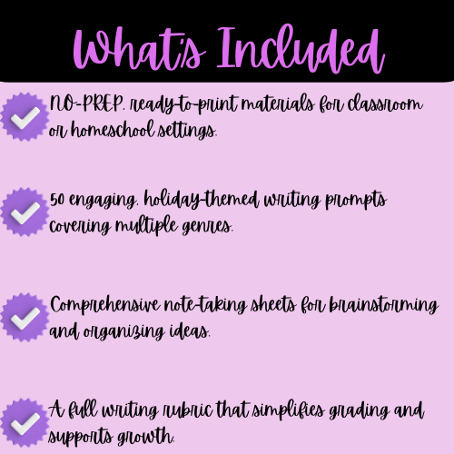 - 50 engaging, holiday-themed writing prompts covering multiple genres.