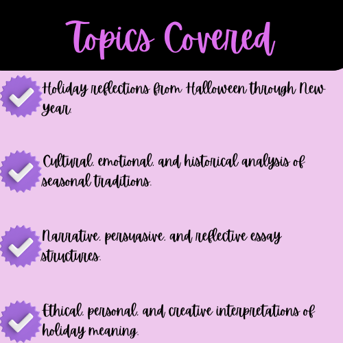 As a homeschool mom teaching a 9th grader, I know how meaningful it is when writing connects to real experiences.  A Season to Write: Holiday Reflection Prompts Bundle was born from my desire to help students/homeschoolers think deeply about the holidays we celebrate while growing their writing skills. This A Season to Write: Holiday Reflection Prompts Bundle resource brings together creative, reflective, and analytical writing—encouraging students/homeschoolers to explore not just what happens during a holiday, but what it means to them. Each prompt invites writers to reflect on memory, culture, and sensory experiences that make the season unique. With a balance of structure and freedom, students/homeschoolers learn to write with both intellect and emotion while developing clarity, organization, and personal voice.