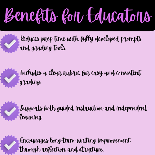 The writing rubric completes this resource by making assessment simple, transparent, and growth-oriented. It breaks down essential elements—content, organization, creativity, grammar, and reflection—so students/homeschoolers can clearly see how their writing develops over time. The rubric helps teachers and homeschool parents evaluate work fairly, while also teaching students/homeschoolers how to self-assess and take ownership of improvement. It is flexible enough to be used across assignments and consistent enough to encourage measurable progress. Grading becomes less about checking boxes and more about nurturing each student’s unique writing journey.