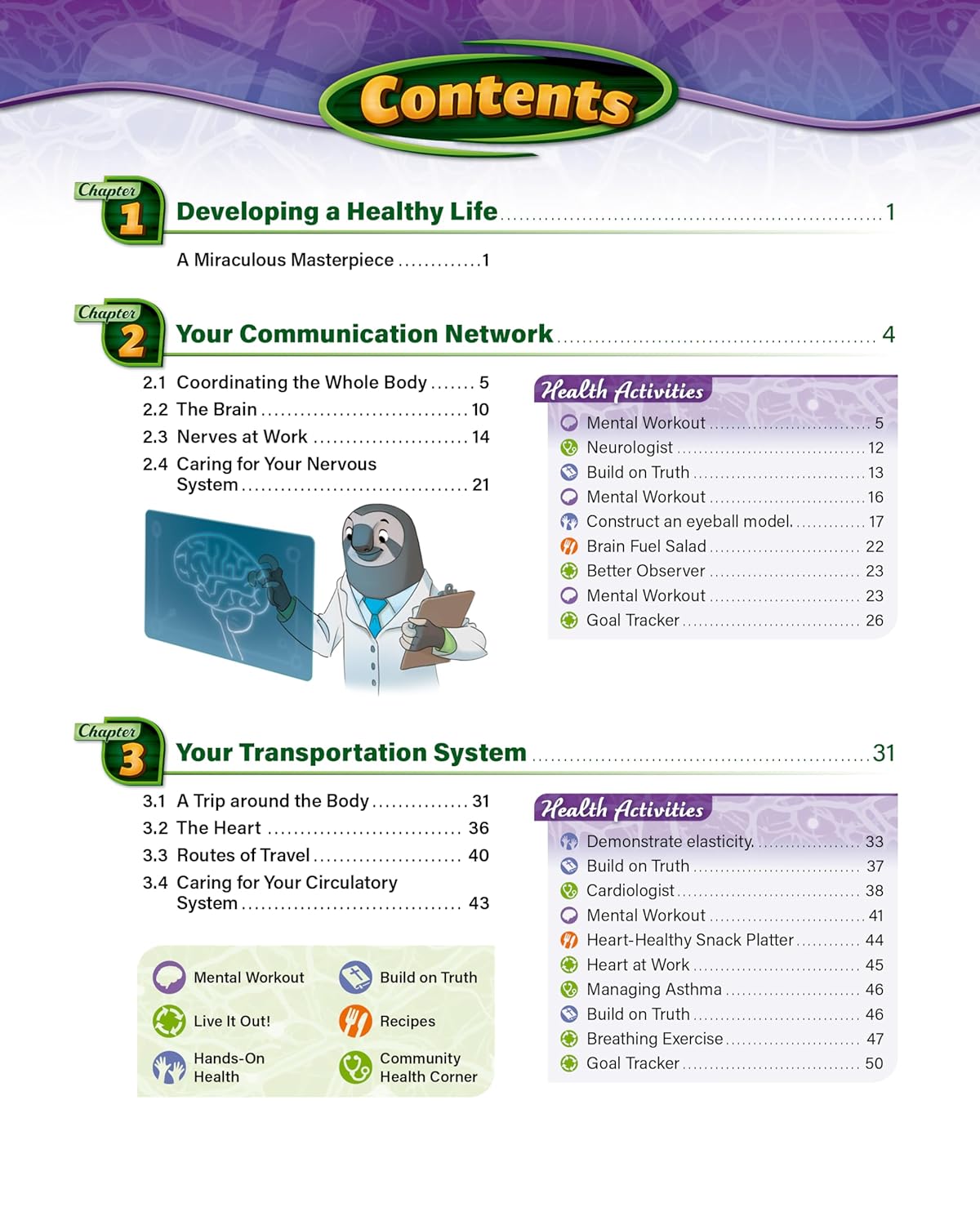 Students will be amazed by God’s ingenious design of the human body as they embark on a head-to-toe journey through five different body systems. Hands-on activities such as exercises, recipes, experiments, and demonstrations solidify practical instruction in fitness, nutrition, and personal safety. Thoughtful guidance on right relationships with God and others will help students develop their spiritual health.