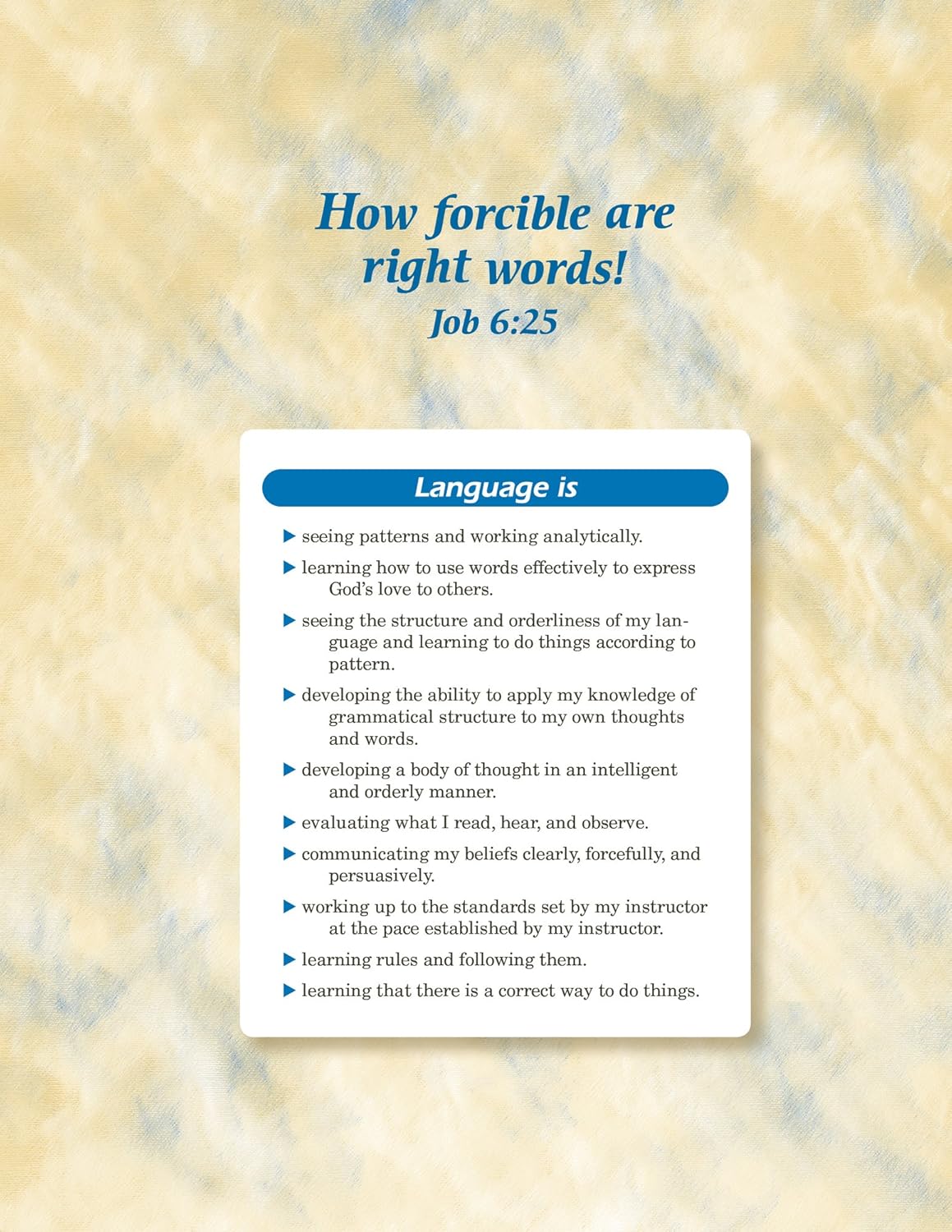 Train your child to be a fantastic communicator through writing with an emphasis on grammar and mechanics within Language B with Abeka. Recognizing complements, identifying adverb and adjective phrases, preparing topical and sentence outlines, diagraming, and perfecting capitalization and punctuation rules are just a few concepts that will propel your child into proper writing. Daily language exercises, creative writing suggestions, and a handbook of rules and definitions give your child the practice and tools to enhance his understanding and use of the English language.