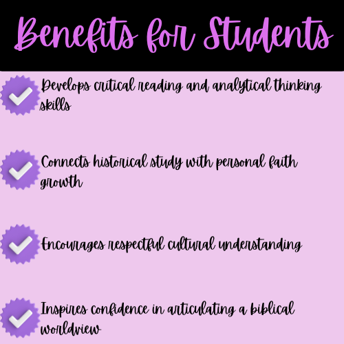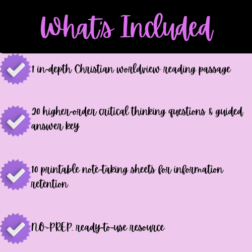 The note-taking sheets in this set are carefully designed to help students/homeschoolers engage actively and independently with the passage. They encourage students/homeschoolers to track key ideas, summarize concepts, and connect scriptural truths to what they’re learning. Each sheet includes prompts for reflection, biblical cross-references, and personal insight—helping students/homeschoolers move beyond memorization into personal application. The structure supports higher-level reading comprehension and organization while keeping faith at the center. Teens can highlight main ideas, jot connections between culture and Christianity, and even write personal prayers or reflections as they learn. For homeschool portfolios, these pages also provide tangible evidence of critical engagement and growth in worldview understanding. They make the learning process interactive, intentional, and spiritually grounded.