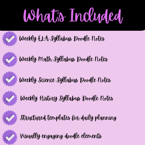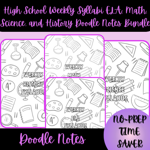 This High School ELA, Math, Science, and History Weekly Syllabi Doodle Notes Bundle offers a unique and powerful way to transform your lesson planning across core subjects. By combining practical organization with the engaging principles of visual learning, this resource empowers educators and homeschool parents to create clear, effective, and even enjoyable weekly plans. Watch as your students or homeschoolers become more engaged, organized, and excited about learning, all thanks to a planning system that speaks to both the logical and creative sides of education. Embrace this bundle and unlock a future of streamlined and inspiring teaching and learning.