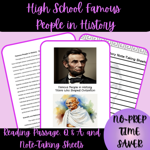 This High School Famous People in History Reading Passage, Q & A, and Note-Taking Sheets comprehensive resource represents everything I believe educational materials should be—rigorous yet accessible, comprehensive yet focused, challenging yet inspiring. By studying the lives and contributions of history’s most remarkable figures, students don’t just learn about the past—they discover models of excellence, innovation, and moral courage that can guide their own life choices and aspirations. The combination of in-depth reading, analytical questions, and structured note-taking creates a complete learning experience that develops both knowledge and skills while fostering a deep appreciation for human potential and achievement. As an educator and parent, I am confident this will become one of those resources you return to again and again, finding new insights and applications each time you use it.