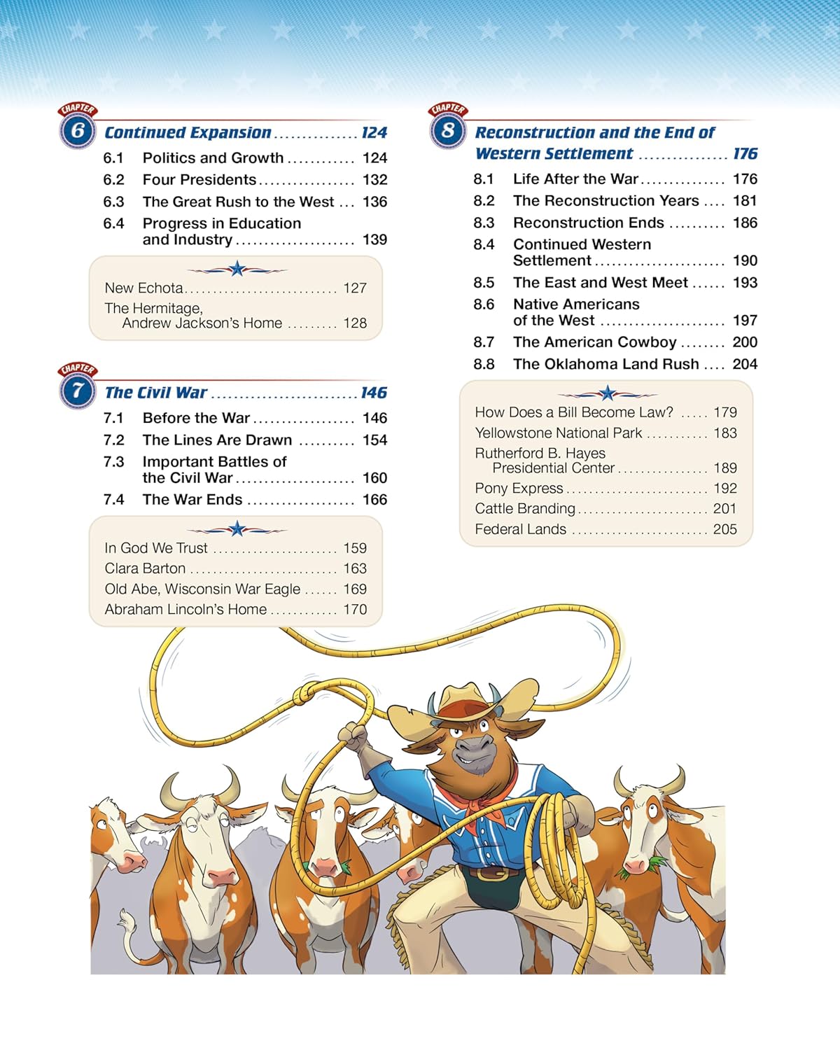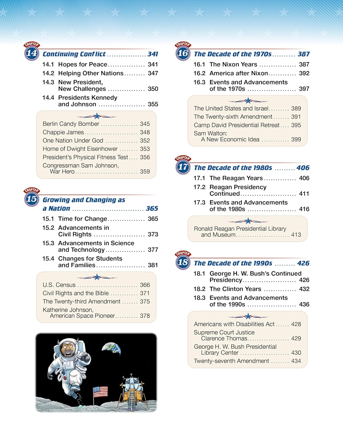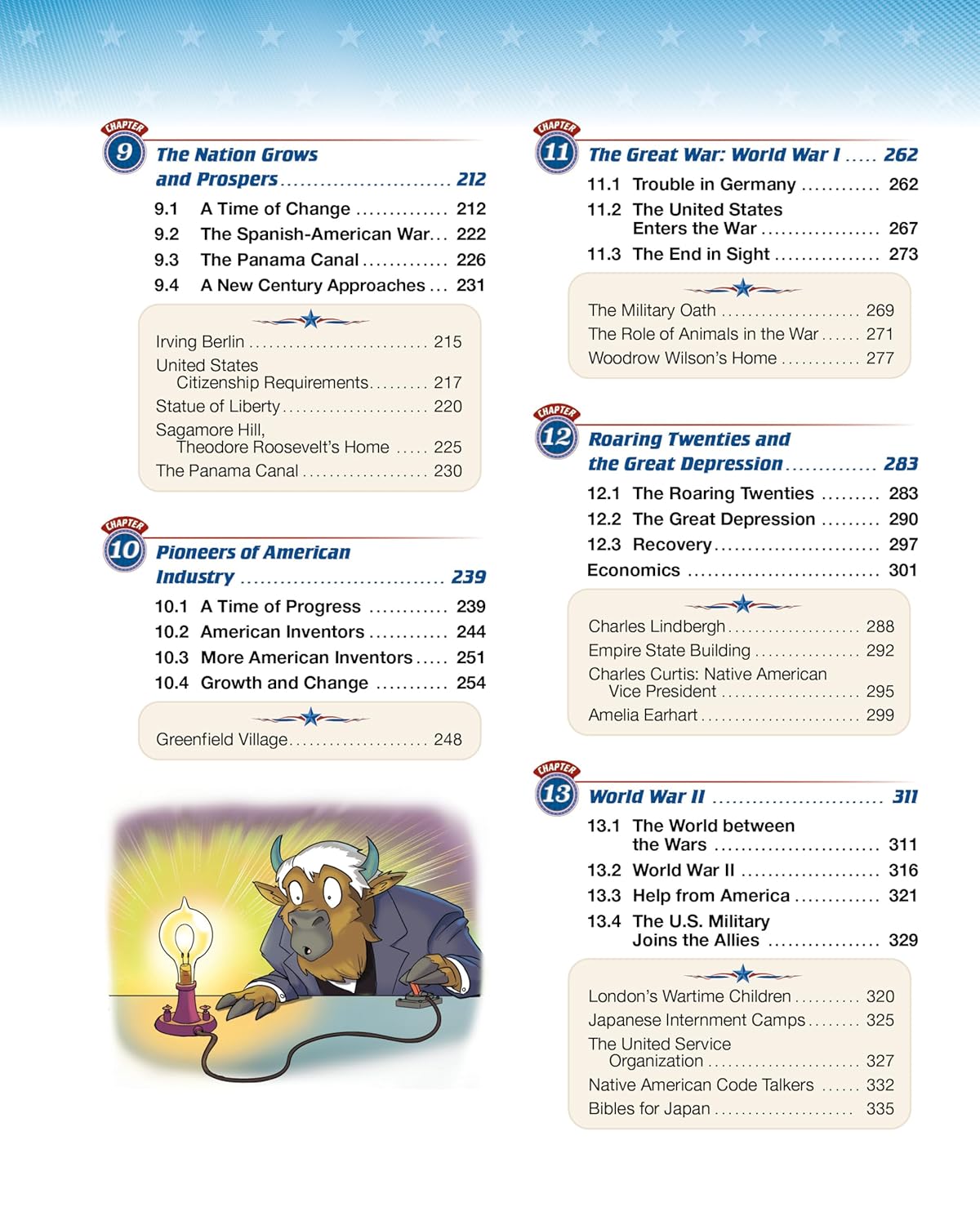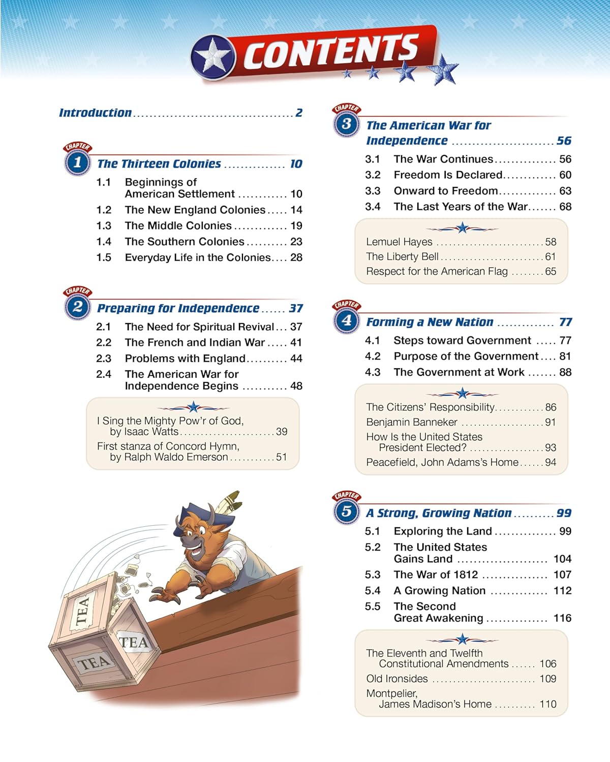 Travel through time and watch the story of the United States unfold. Engaging text and captivating photos/illustrations sweep students into the exciting events of America’s history. From early colonization to the present day, students will encounter the people, places, and events that shaped the United States into the nation it is today, inspiring love and respect for their country. Geography studies explore the five regions of the United States—including climates, topographies, industries, and more. Interesting feature boxes in each chapter highlight historical figures and fascinating facts. Feature boxes on government and economics introduce these concepts on a fourth-grade level. Comprehension Checks and Chapter Checkups ensure that students are retaining key information. Full-year study includes six weeks of state history and two weeks of World Geography.