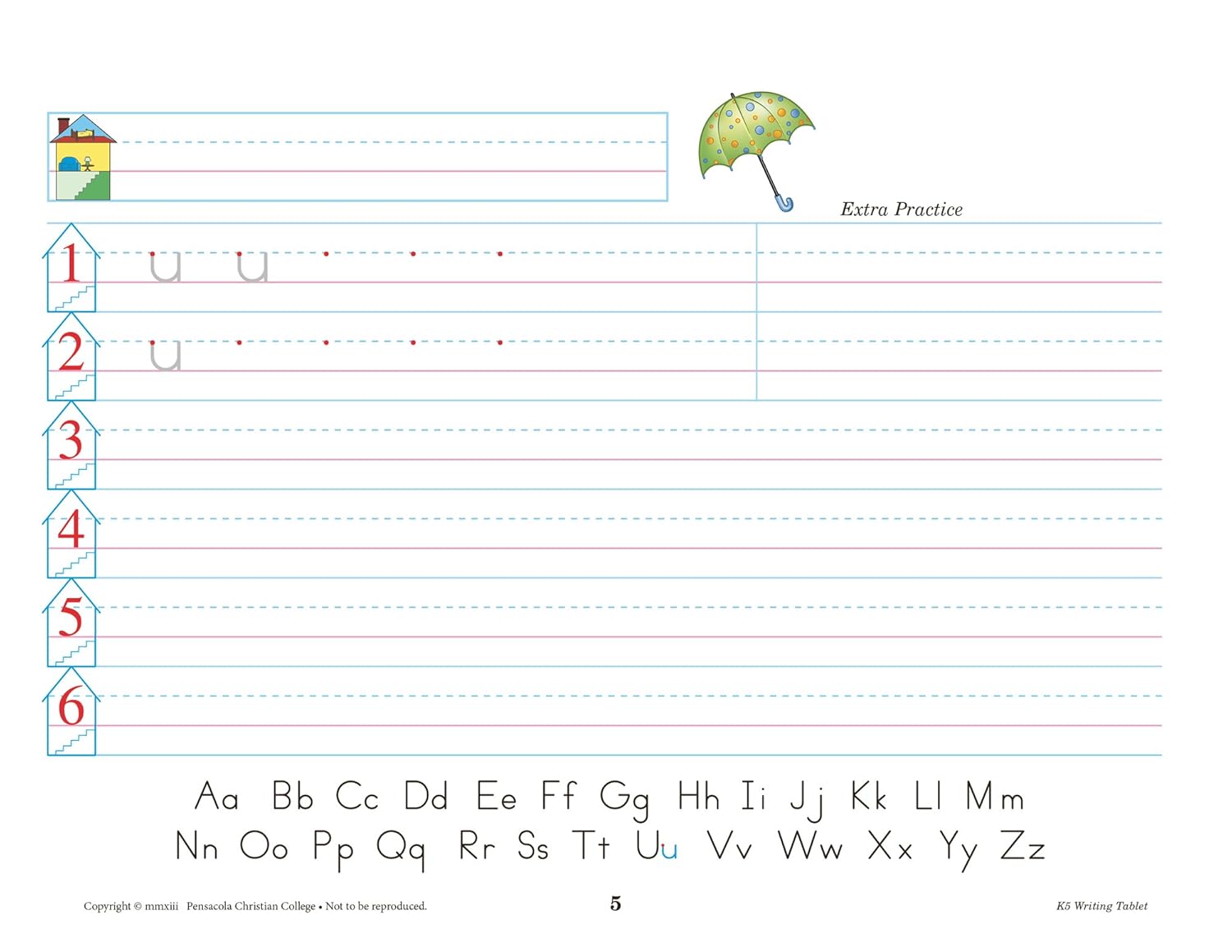 With pages lined and marked for easy formation, this K5 Writing Tablet from Abeka provides your child with the tools needed for developing his writing skills. Using the K5 Writing Tablet your child will learn to hold a pencil properly, how trace and form each letter, and recognize capital and lowercase letters. Sample letters aid in the correct formation of each letter while the houses on each page help your child find where the letters should be placed on the lines. Capital letters are included to aid in your child being able to write his name correctly. Space is provided, ensuring that your child will be able to grasp the concepts of cursive writing. Teach correct hand positions to your left or right-handed child with an illustration of correct hand positions.