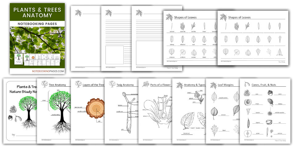 Diagrams and notebooking pages for the anatomy of plants and trees.