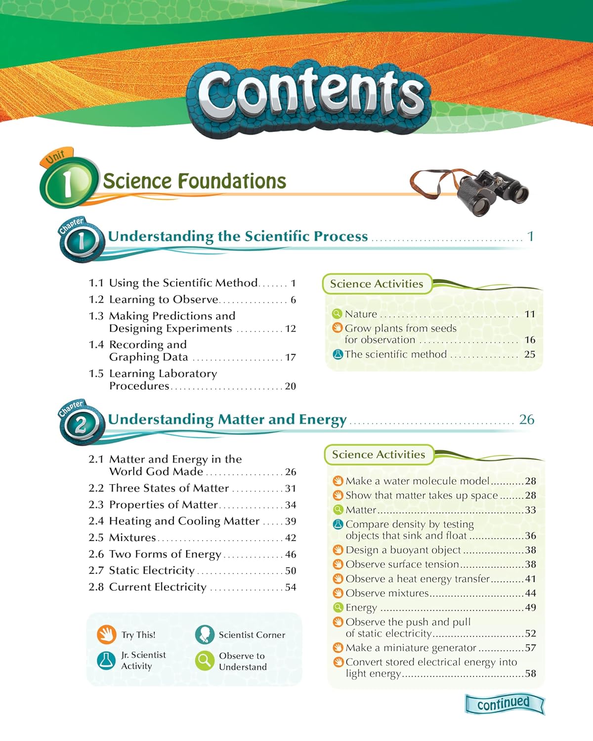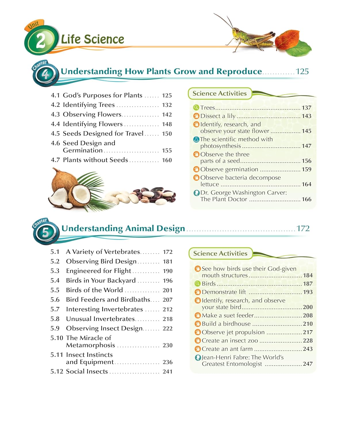 Take students on a journey to discover the Creator’s detailed design in the world around them. Demonstrations and STEM Activities implementing the scientific method, show students how broad scientific concepts relate to their daily lives. Students will become botanists that identify and dissect plants, meteorologists that track and interpret weather patterns, ecologists that study how organisms relate to their physical surroundings, and geologists that study the earth’s physical structure. Demonstrations paired with detailed illustrations help students understand abstract concepts such as matter, energy, force, and motion. Comprehension Checks and Chapter Concept Reviews ensure that students are retaining key information.